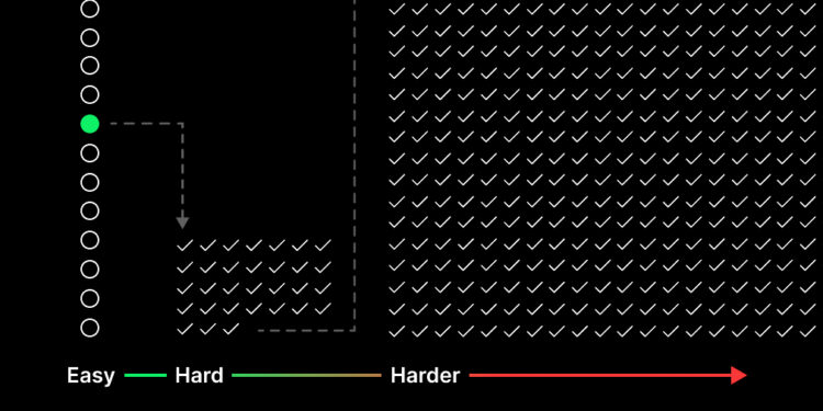 - Dưới cùng: Một đường thẳng ngang gradient từ xanh lá (Easy) sang vàng cam (Hard – Khó khăn) rồi đỏ (Harder – Khó hơn), với mũi tên chỉ sang phải nhấn mạnh sự tăng dần về độ khó.