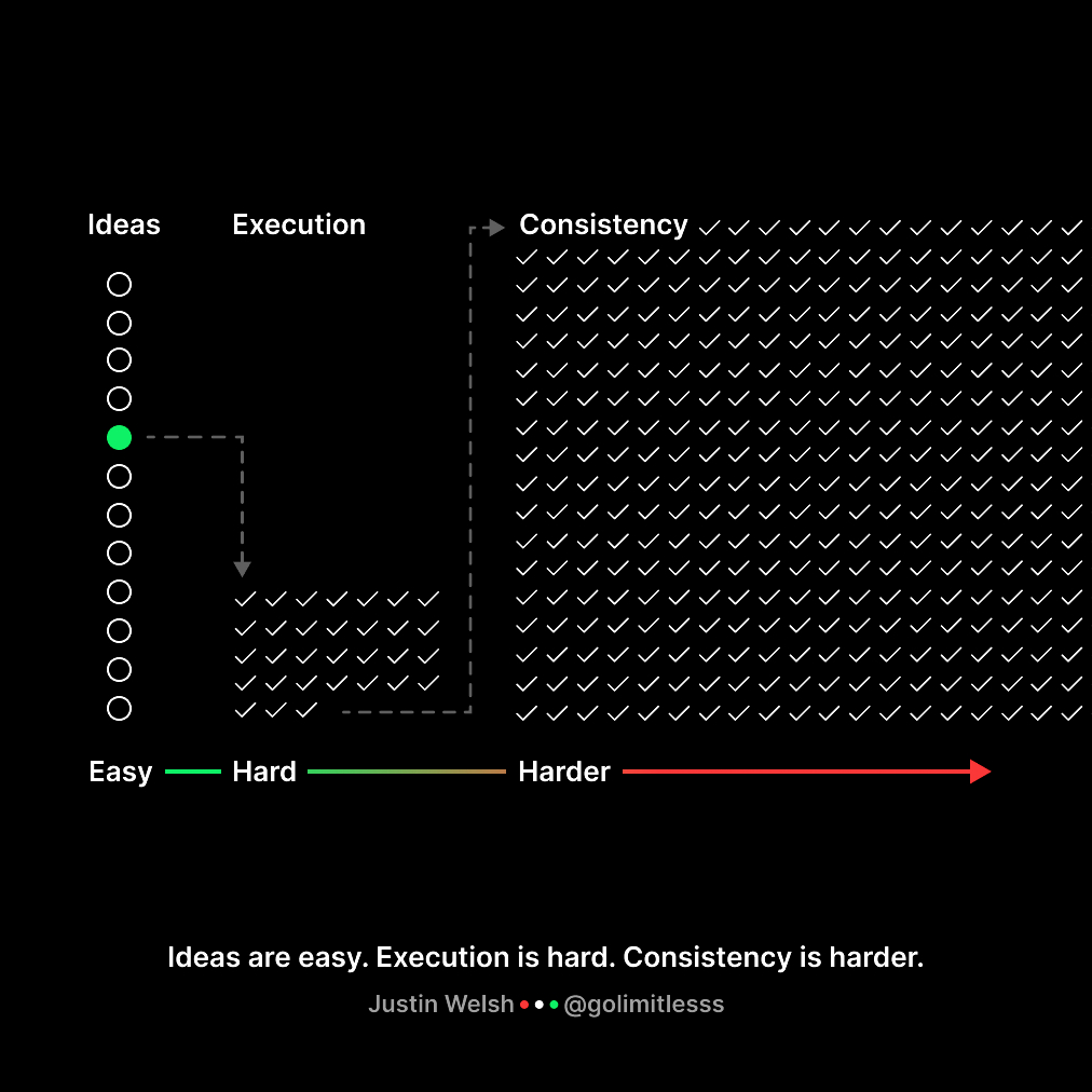 - Dòng caption chính: “Ideas are easy. Execution is hard. Consistency is harder.” (Ý tưởng thì dễ. Thực hiện thì khó. Tính nhất quán thì khó hơn.)