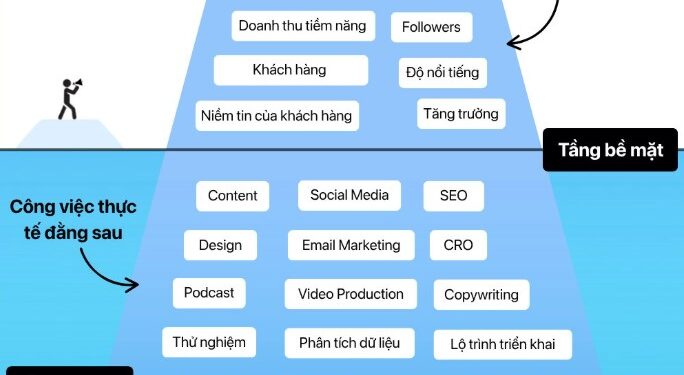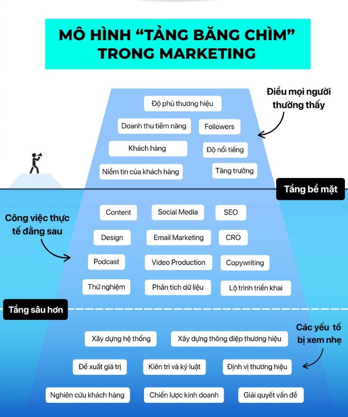 Dựa trên infographic được cung cấp, tôi sẽ viết lại mô hình này dưới dạng văn bản có cấu trúc rõ ràng, dễ hiểu hơn, thay vì dạng hình ảnh. Mô hình này sử dụng ẩn dụ về tảng băng chìm (iceberg) để minh họa rằng trong marketing, những gì mọi người thường thấy (phần nổi) chỉ là “đỉnh băng” nhỏ bé, trong khi phần lớn công việc và nền tảng thực sự nằm ở “phần chìm” bên dưới. Điều này nhấn mạnh rằng thành công bề mặt phụ thuộc vào các yếu tố ẩn sâu, đòi hỏi nỗ lực liên tục và chiến lược dài hạn.