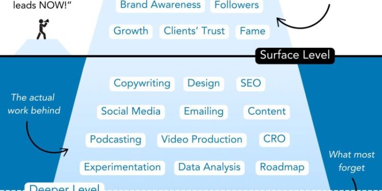 Ẩn dụ núi băng ở đây ngụ ý rằng trong marketing, những kết quả dễ thấy (như doanh thu, leads) chỉ là phần nổi nhỏ bé, trong khi phần lớn công việc thực sự (chiến lược, nghiên cứu) nằm ẩn sâu bên dưới, đòi hỏi nỗ lực lớn hơn nhưng thường bị bỏ qua.