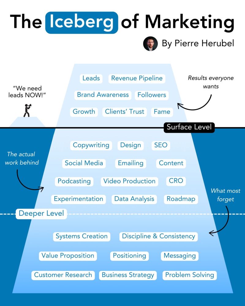 Hình ảnh này là một biểu đồ minh họa dưới dạng “núi băng” (iceberg), một ẩn dụ phổ biến để mô tả sự khác biệt giữa phần nổi (visible) và phần chìm (hidden). Tiêu đề chính là “The Iceberg of Marketing” (Núi Băng Của Marketing), được tạo bởi Pierre Herubel. Biểu đồ được thiết kế với tông màu xanh dương gradient, từ nhạt ở trên xuống đậm ở dưới, tượng trưng cho nước biển và độ sâu. Cấu trúc là một hình tam giác ngược (pyramid-like), với phần đỉnh nhọn ở trên đại diện cho “mũi băng” nổi trên mặt nước, và phần đáy rộng dần xuống dưới đại diện cho phần chìm sâu hơn.